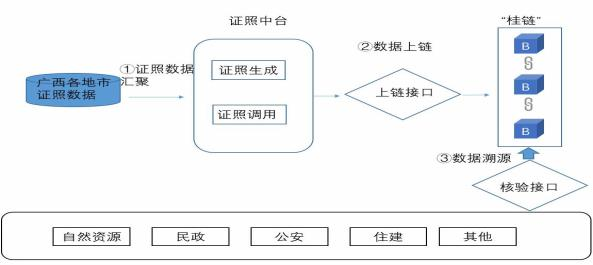 (2)数据流转。证照中台汇聚各地市证照数据,通过中台将数据 上链后各厅局对证照数据进行溯源核验。“桂链 ”支持SM2 、SM3和 SM5等多种国密算法, 目前链上汇聚证照总数共计1亿4千万条,涉及 证照类型多达500多种。