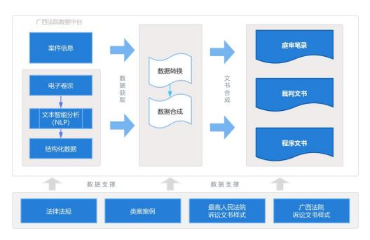 文书起草数据获取来源包括三个方面:一是案件信息,案件信息 是指从法院接收到案件开始,在审判流程系统中形成的贯穿案件全过 程的结构化信息。二是电子卷宗,文书起草时调用诉讼过程中的所有 卷宗材料,通过文本分析的NLP技术,将卷宗内客观形成或主观认定的 文字性信息形成结构化数据,现已支持一百种以上电子卷宗材料的智 能提取。三是法律及案例,系统参照国家颁布的法律法规以及司法解 释等文件,以及各级法院办案形成的文书案例,可根据案件特征自动 推送类案案例及应用法律条文。结合三方面的数据来源,同时结合符 合最高人民法院及广西法院发布的标准诉讼文书样式规定的文书模板, 系统即可规范合成法律文书。