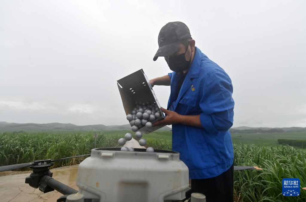 7月23日,在位于广西上思县的昌菱农场蔗区,技术人员在将螟黄赤眼蜂球倒入无人机。新华社记者 陆波岸 摄